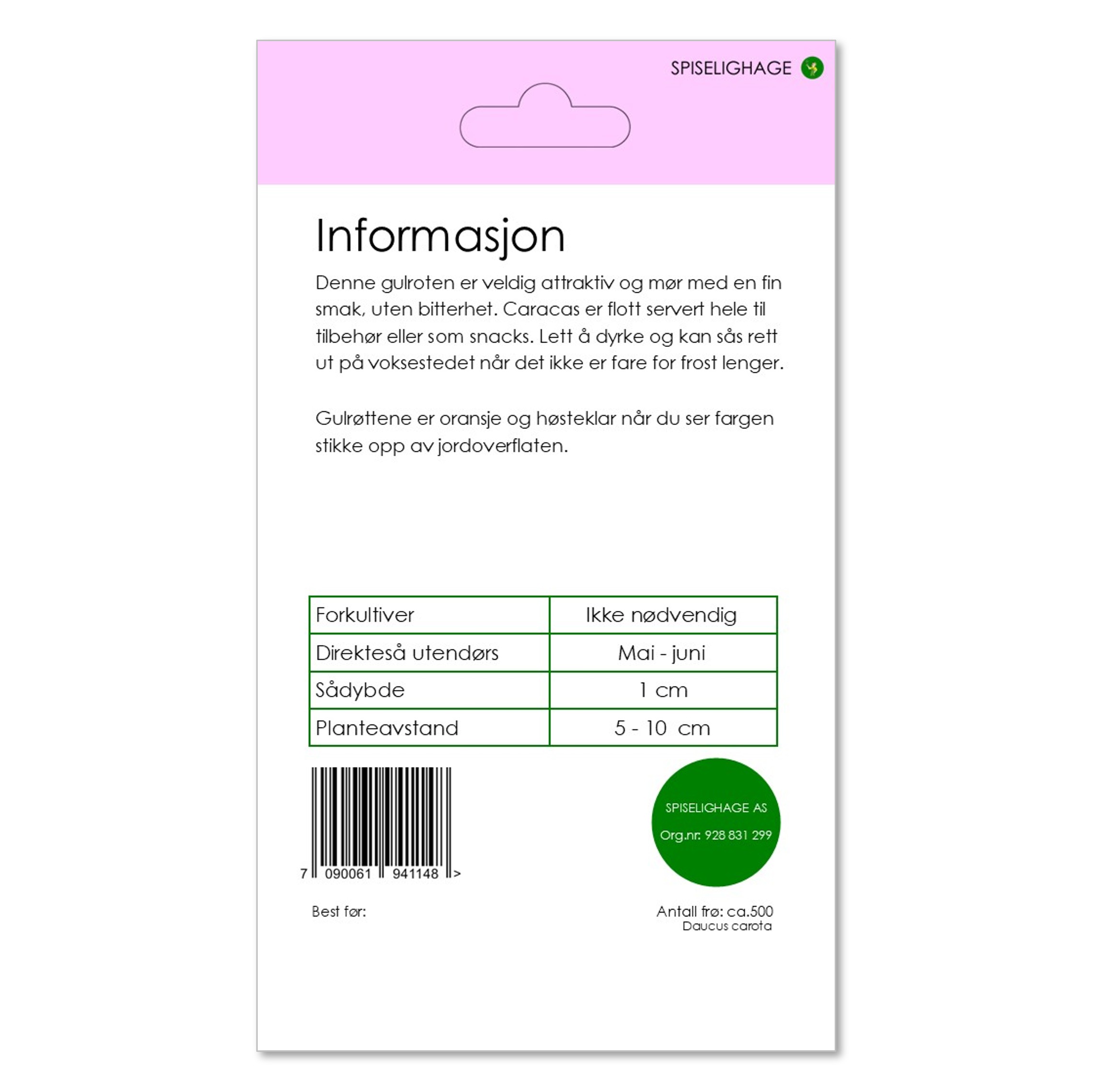 Denne gulroten er veldig attraktiv og mør med en fin smak, uten bitterhet. Caracas er flott servert hele til tilbehør eller som snacks. Lett å dyrke og kan sås rett ut på voksestedet når det ikke er fare for frost lenger. Gulrøttene er oransje og høsteklar når du ser fargen stikke opp av jordoverflaten.